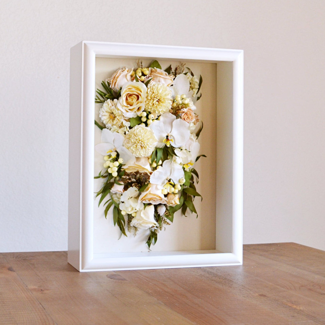 All of our preservation options can be customized for memorial pieces. When shipping or dropping off your flowers, you are welcome to include photos, charms, or other meaningful momentos to be thoughtfully incorporated into your design. These personal touches help us create a truly one-of-a-kind piece that reflects the life and love you wish to honor.